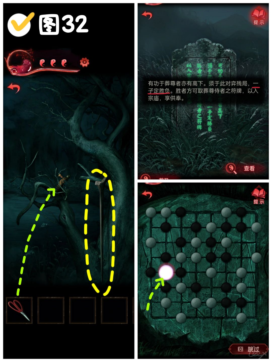 【红·王娇彤】村口左转,爬到树上,拿到〔拐杖〕,用剪刀剪下左侧的树枝。下去点击观察石碑,“对弈残局,一子定胜负”,当做五子棋下(耍赖),落子第5行第2列,拿到〔无面雕像〕。(图32)