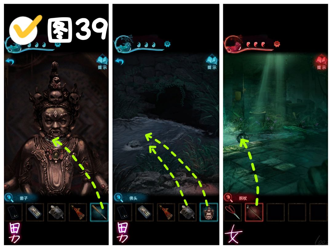 【红·王娇彤】地下,对佛头使用拐杖,佛头压住机关,男女主可以同时到达地下了。(如果提示没有支点,就是没将石龟扔入河中)(图39)
