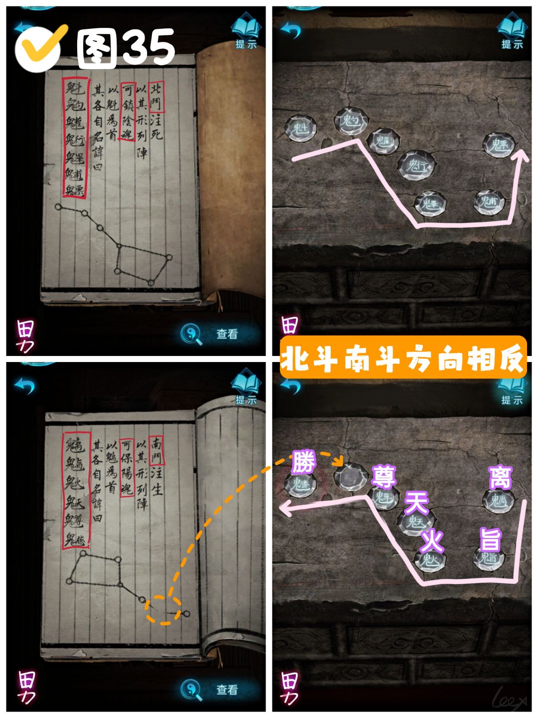 【蓝·申墨卿】打开横梁右侧书柜,阅读《名諱秘字》,根据第一页和第二页的线索,将死阵改为生阵,保阳魂,即北斗改为南斗。