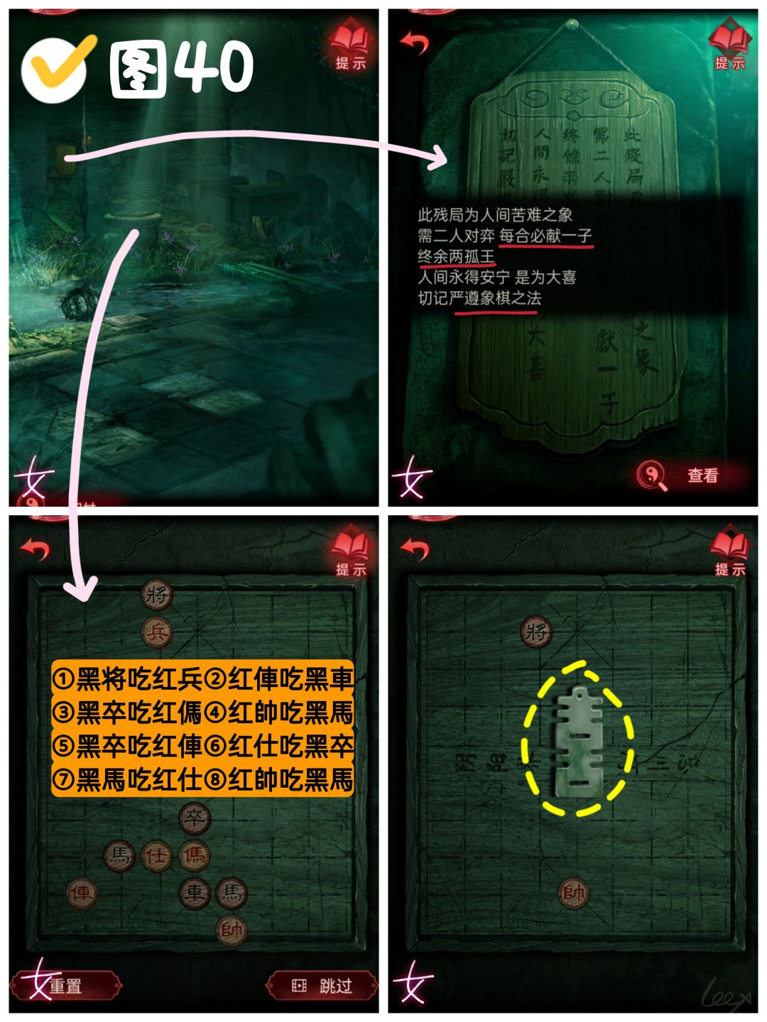 【红·王娇彤】观察左侧注意上的碑文,“二人对弈,每局必吃一子,留下将帅”,点击残局对弈,这里需要以女主角色下棋,下棋过程中无须切换角色。步骤:①黑将吃红兵②红俥吃黑車③黑卒吃红傌④红帥吃黑馬⑤黑卒吃红俥⑥红仕吃黑卒⑦黑馬吃红仕⑧红帥吃黑馬。(附动图)完成残局获得〔阴喜字〕。(图40+动图)