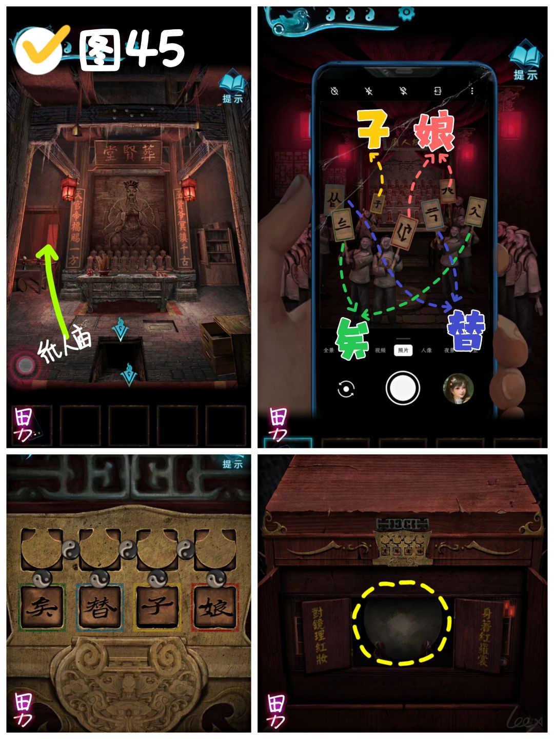 拿出手机照纸人,观察纸人举的牌子,组合同色框内的笔画,“绿矣-蓝替-黄子-红娘”,根据组成的文字解锁祠堂外台阶旁的柜子(附动图)。