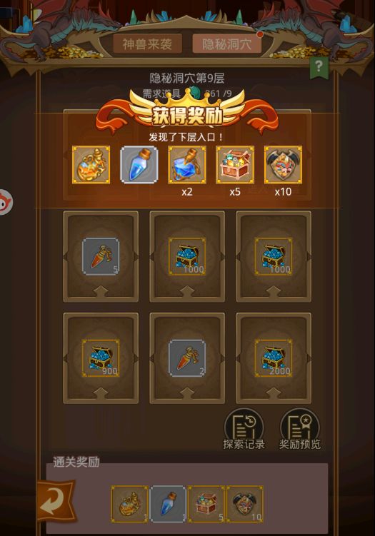 ★隐秘洞穴共9层,每层共有9个随机入口,找到下一层入口可以获得本层的通关奖励,通关第9层除了能够获得通关奖励(必定获得神兽-夕龙魂)之外,还能随机获得额外奖励。