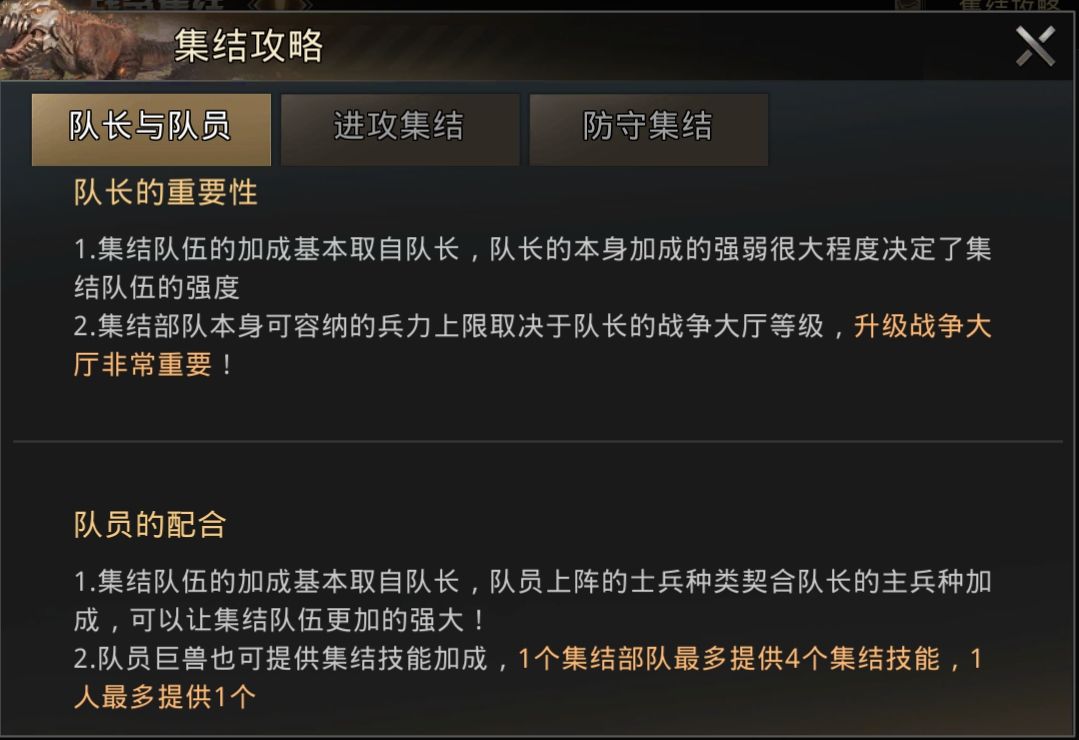 ③集结兵数主要看队长的战争大厅等级,还有队长的巨兽加成。部分巨兽有集结加成技能,单人进攻有时候不如集结划算。