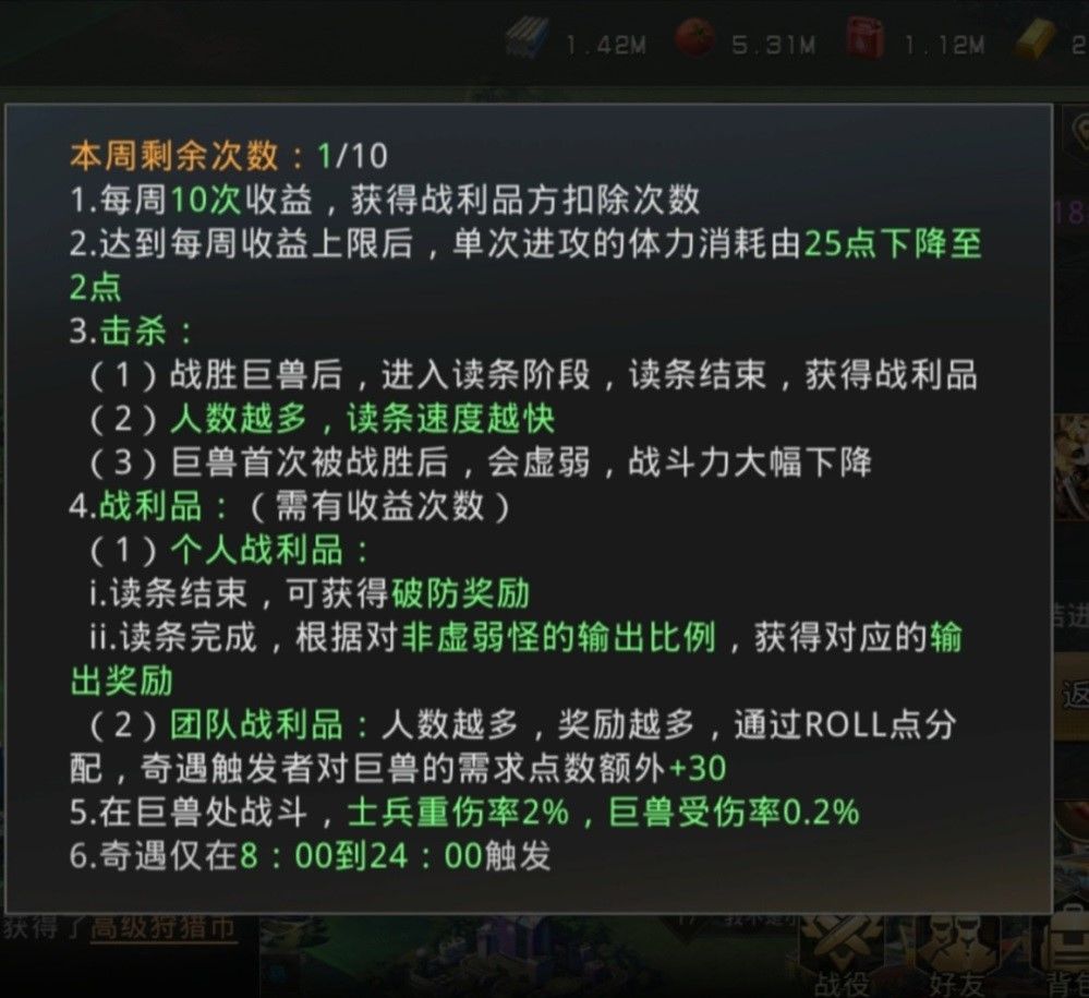 建议大家奇遇打高级的,因为参加奇遇的次数有上限,每周限制10次。打奇遇集结的人越多,出现橙色巨兽几率就越高。