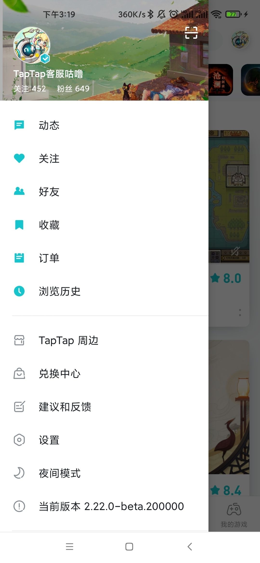 (2) 官方论坛:安卓端APP左侧边栏点击建议与反馈-官方论坛,iOS端用户可直接搜索“TapTap”进入官方论坛