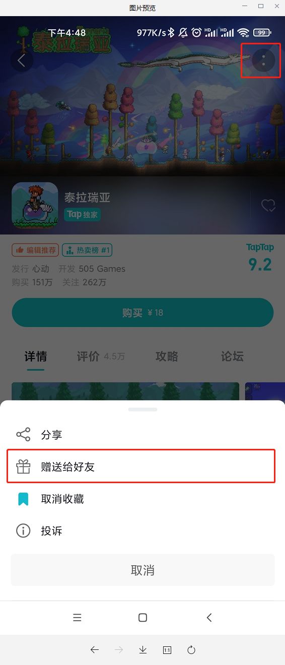 赠送游戏需要在游戏详情页右上角点击两点,选择赠送给好友,购买后在订单中心将兑换码发送给好友,在兑换中心兑换即可(注:因兑换码订单特殊性不支持退款)