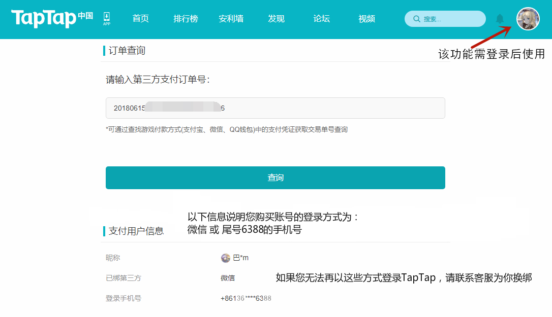 可通过查找游戏付款方式(支付宝、微信、QQ钱包)中的支付凭证获取“订单号”,再到订单查询界面查询即可,订单查询链接:https://www.taptap.com/payment/order/search