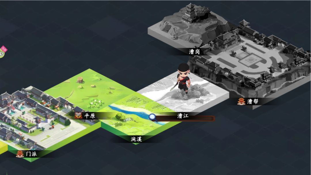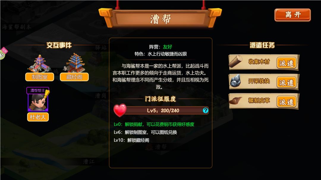 当完成一个区域的战斗后,这个区域会成为各位掌门派遣门下侠客的地方(初始的神农帮可以探索蕴气林),并收获不同的物资,比如漕帮就可以收集木材、铁块、皮革三种不同的资源。所以,想要同时派遣多个地点,就需要拥有多位侠客,这也是上一课里讲到的“人口”的重要性。
