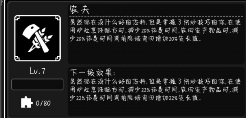 减少游戏内时间。作用低于[工匠]一类。不常用。
