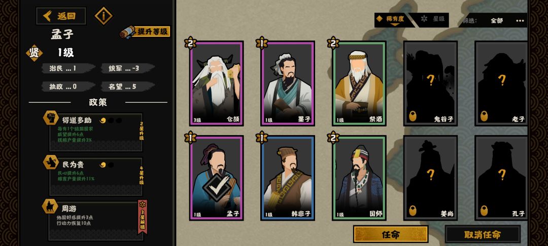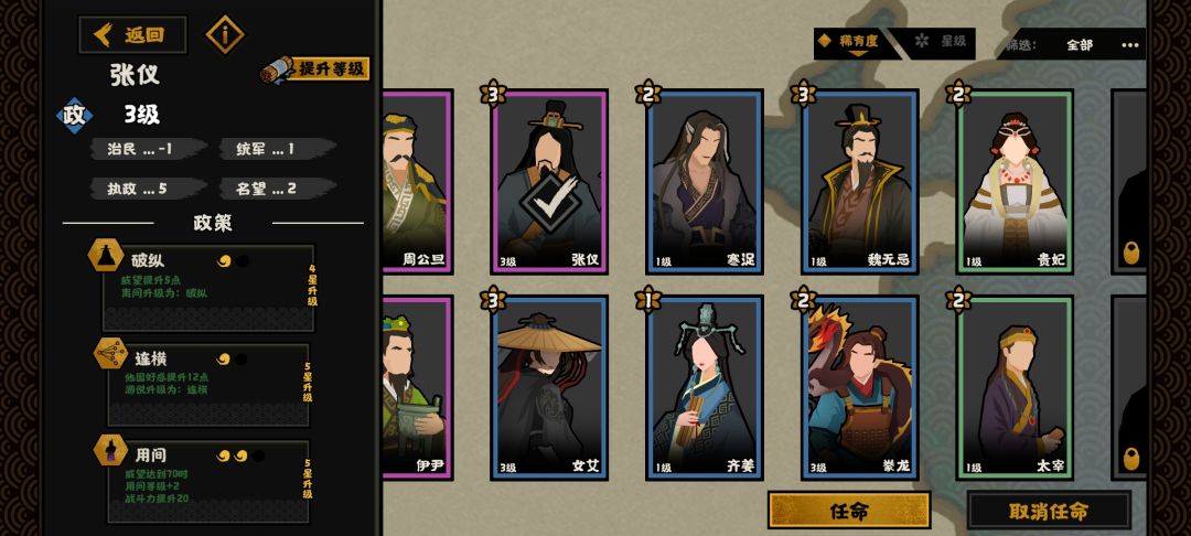 张仪的连横可以使得好感度提升到16点,是非常离谱的数值了已经,前期由于等级较低因此成功概率并不高,但是只要我们的威望达到70这个大数值,就意味着整盘棋已经完全活跃起来了。这个时候正常情况下我们已经拥有了四个城池(玩齐国的情况下,因为齐国对于其他国家的好感度都很高,平均都是40多),如果用齐国,主要攻伐魏国和赵国这两个国家。