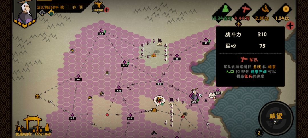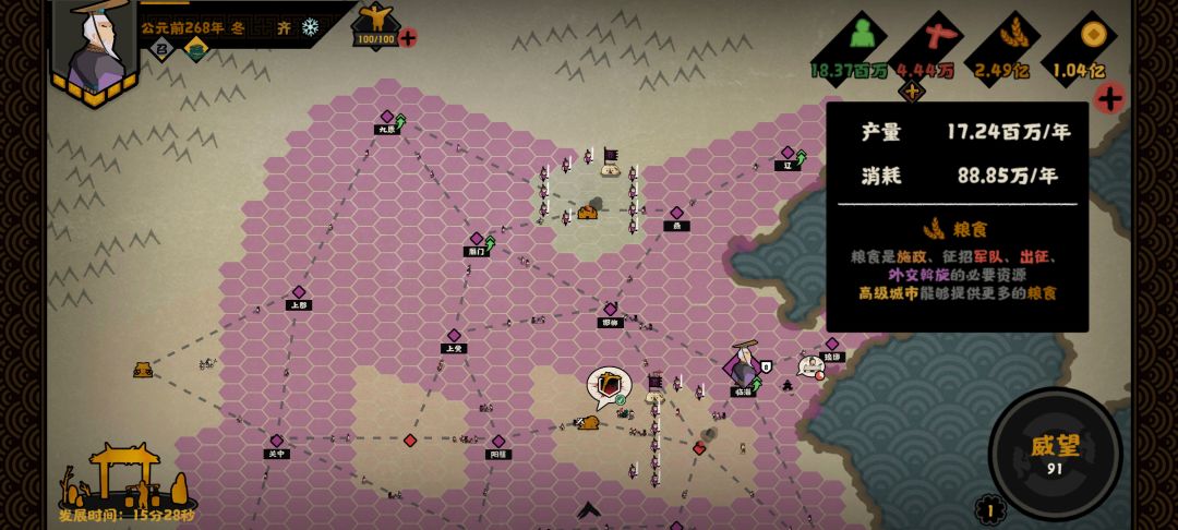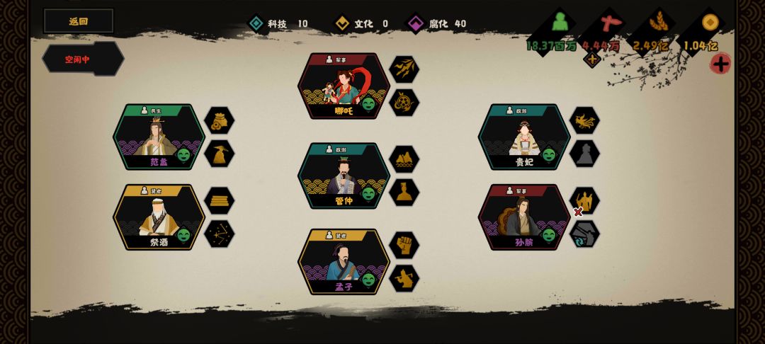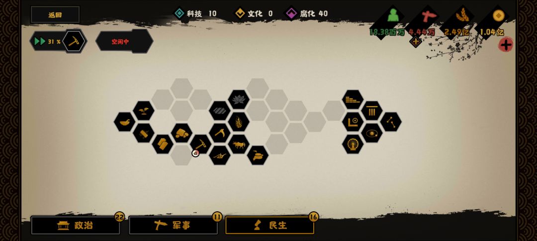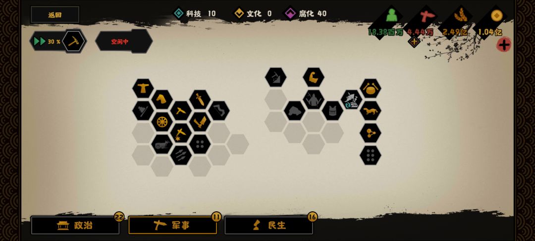 这是各项研发,注意,名臣技能我点了多盟友多钱粮,还有加友好度,开局钱粮直接送礼激活周边三个盟友,拿白板地块,也不会开局就被别国打一顿。