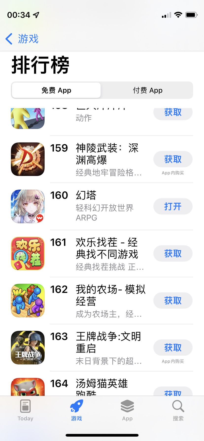 今天看看有没有什么新游戏,结果,我尼玛,好吗!这b已经到160名了,都和一些什么游戏在一起排着了,幻塔,你继续加油哈,马上就看不见你了,还好就一个月卡,马上也到期了,啧啧