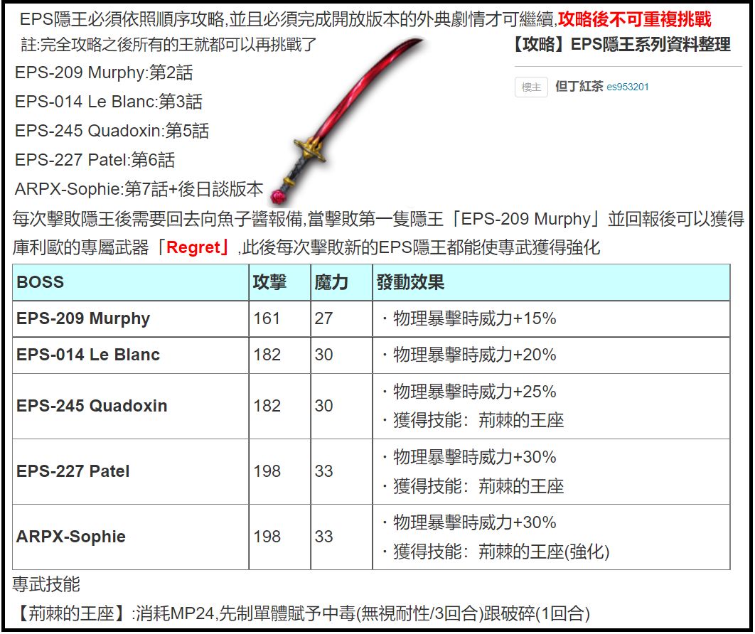 ②隐王EPS-014 Le Blanc:在IDA学院L栋和鱼子酱对话→到劳拉巨蛋城挑战EPS-014 Le Blanc→战胜后向鱼子酱汇报→获得属性耐性UP<刀>,库利欧专武Regret强化。