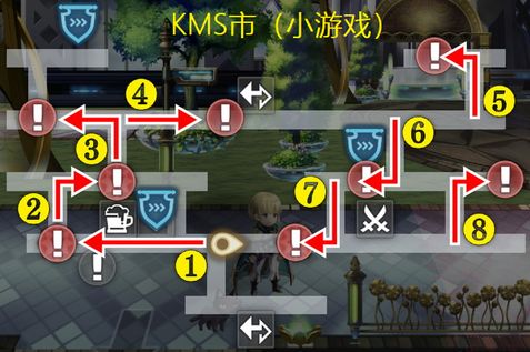 ①KMS市餐馆事件(可能第6话实装后就有了):在KMS市酒馆的餐馆大厅点蓝绿色叹号→找5个闪光(酒馆柜台右上、酒馆外左边、中央大厦入口左边、武器店的屋顶左边、武器店的杂货店左下)→点蓝绿色叹号观看5个小剧情→得到铜勋章×5