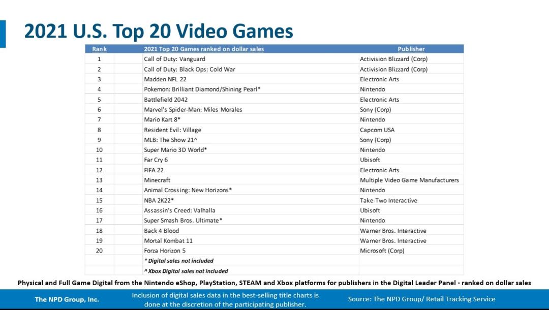 据美国NPD统计数据,2021年最畅销以及最高美元销售额的主机都是NS,而最畅销游戏则是《使命召唤:先锋》。