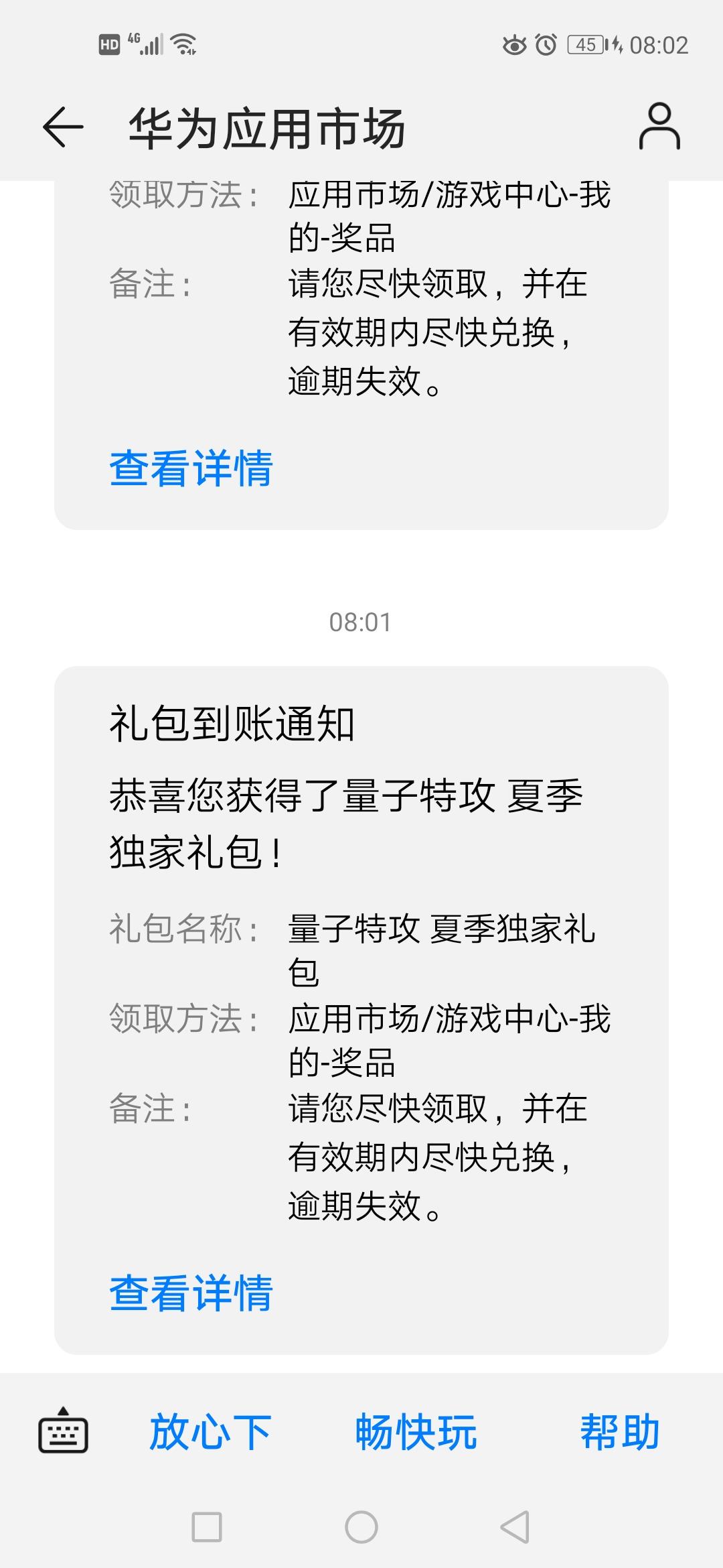 之前反馈的礼包领不了,原来是华为游戏中心发的信息,图来了