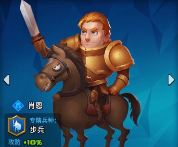 初始英雄肖恩—步兵+攻防10%(适用所有步兵)对于前期大部分兵都是步兵,适合搭配步兵打出较好的效果。