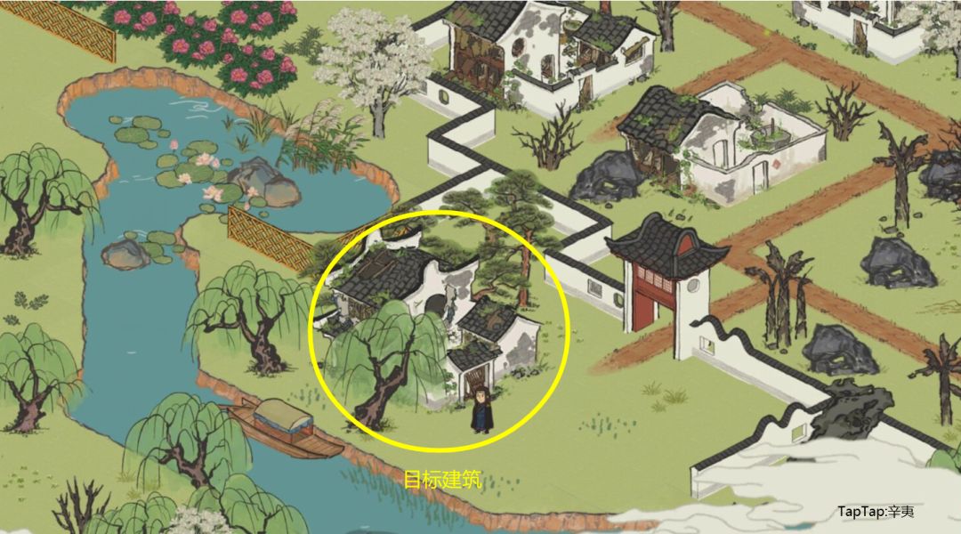 找到五级民宅外观(查看需要玉兰花×4)的才是目标建筑,其他的是浇灌枯树用的