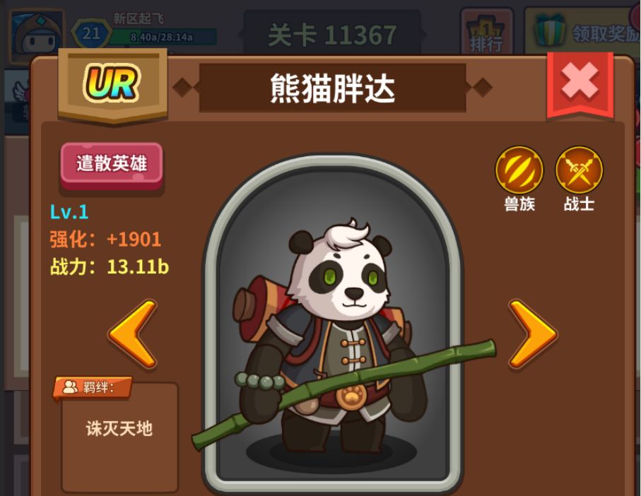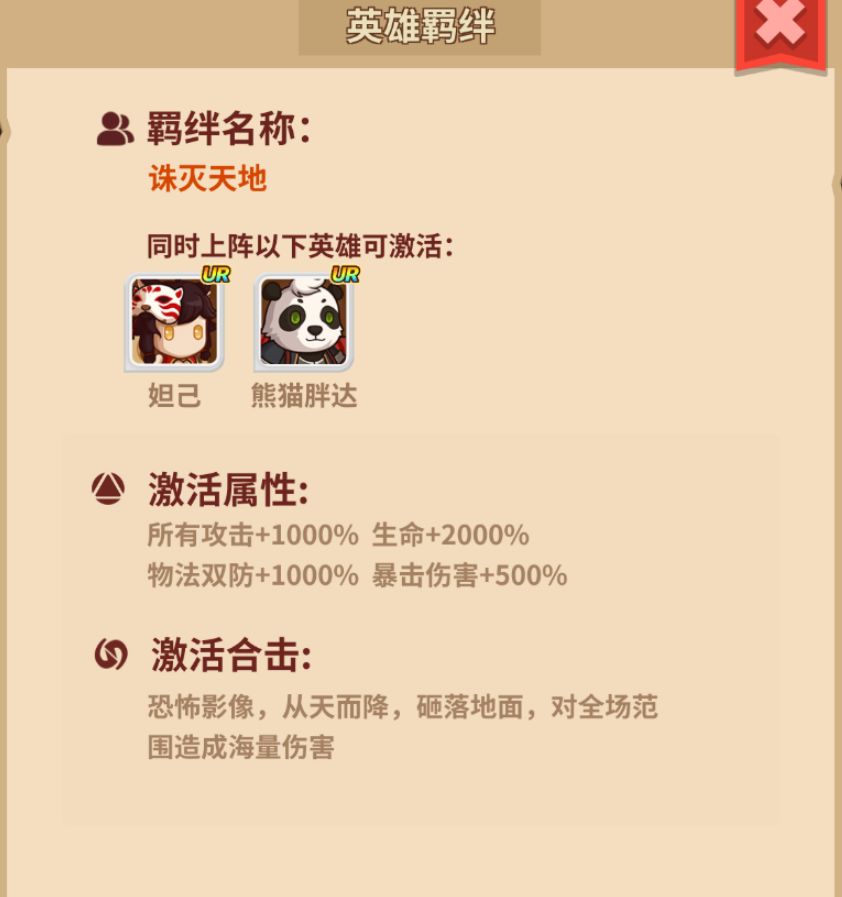 比如同时上阵了妲己与熊猫胖达,即可令2个英雄的属性都带来大幅提升,还能解锁强大的合击技能,扫怪能量提升几个层次!