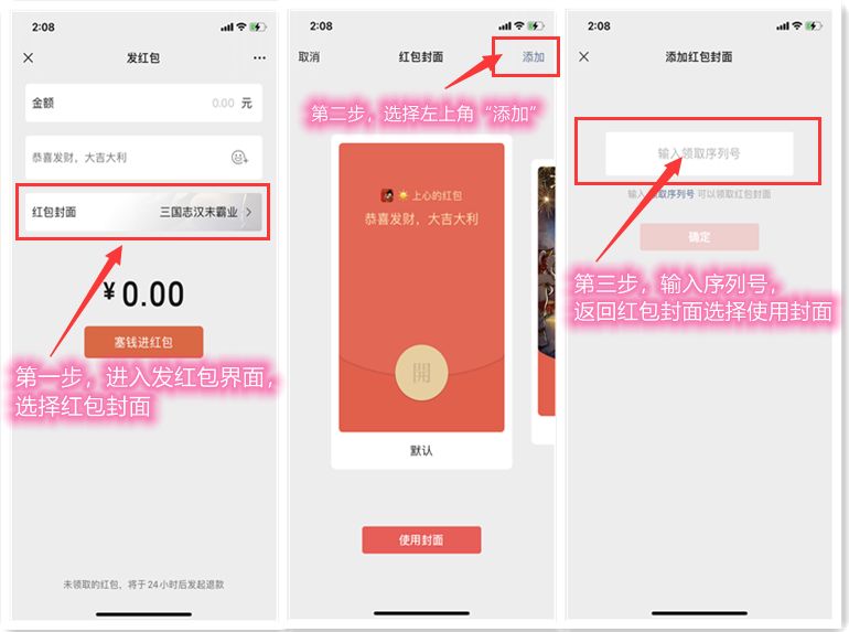 在微信中任意选择一人打开聊天框-选择红包-点击红封面-右上角添加-输入序列号确定即可领取红包封面。