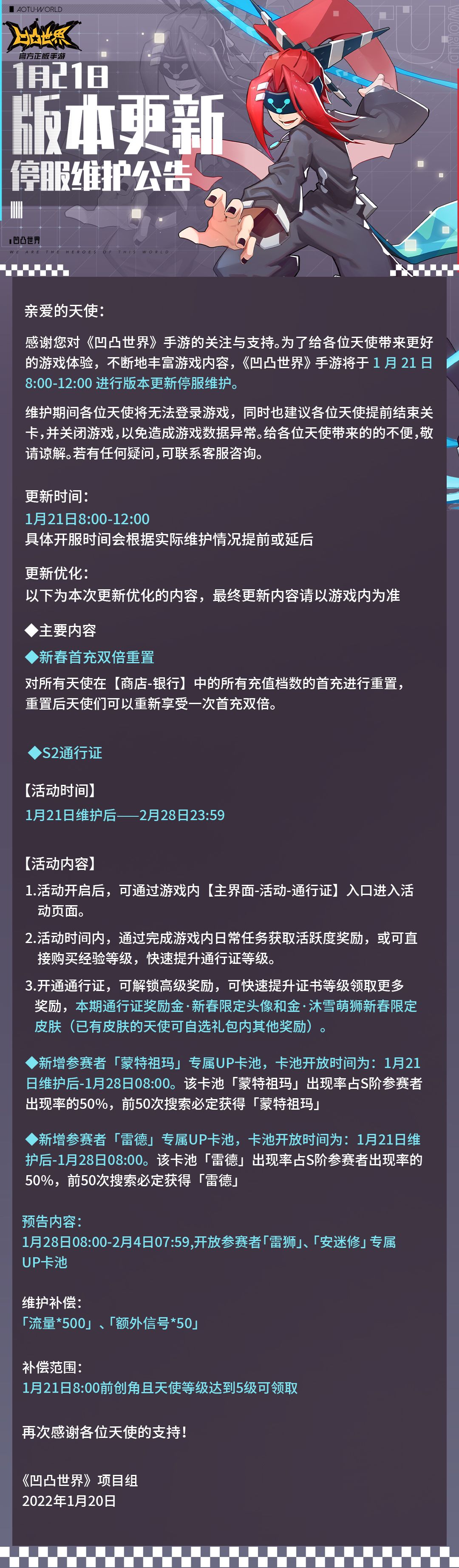 感谢您对《凹凸世界》手游的关注与支持。为了给各位天使带来更好的游戏体验,不断地丰富游戏内容,《凹凸世界》手游将于1月21日8:00-12:00进行版本更新停服维护。