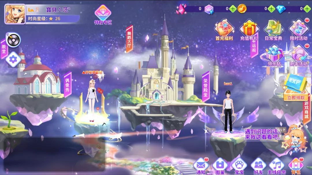 在本次的更新中,游戏主界面将从原来的”海底水晶宫“晋升为”天空城堡“,漂浮的小岛,承载着城堡的建筑,宛若在虚无的云端之上,彩虹之路若隐若现,白天云朵环绕,仙气飘飘,夜晚星光闪耀,流星划过,日夜场景跟随时间进行交替,令人耳目一新!