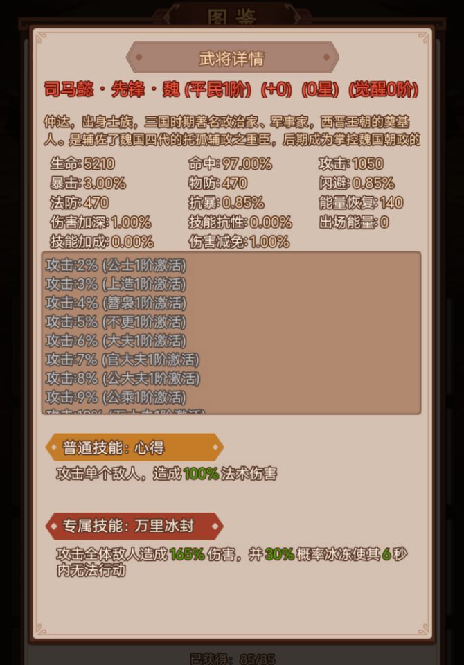 司马懿基础属性比普通七星武将多加%10。PVE副本技能雷暴旋风能对敌人造成多次法术伤害!兵种是军师,群体攻击带燃烧效果,在副本能把集中在一起的怪统统消灭掉。竞技场技能加强%35的攻击力下降%20的防御,技能仅次于神将吕布之下!