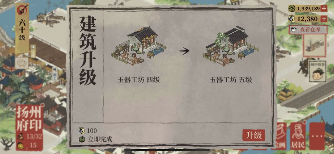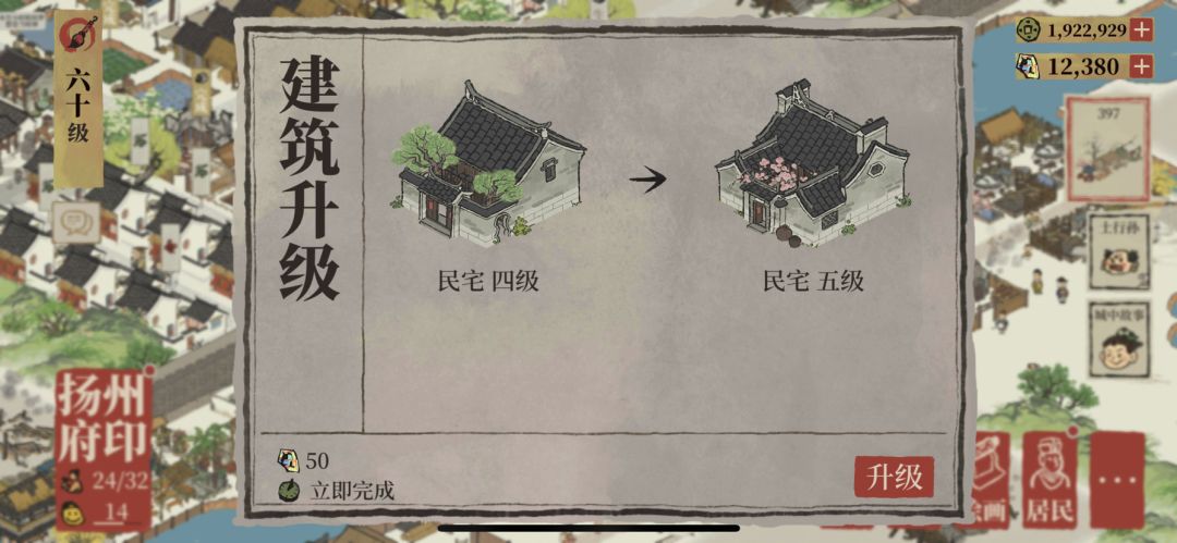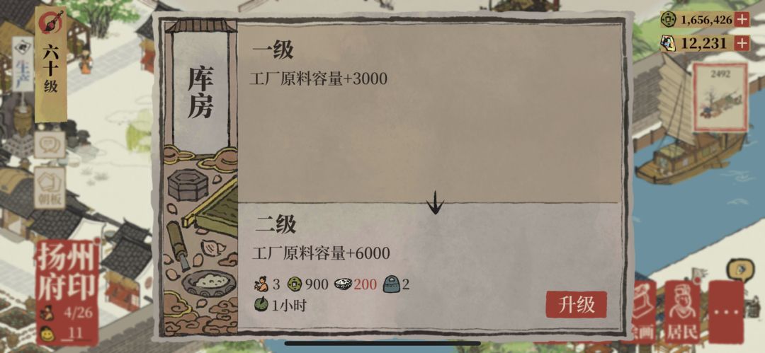 建议先升级香粉厂,建造升级库房,然后升级居民房屋,最后升级职工宿舍。