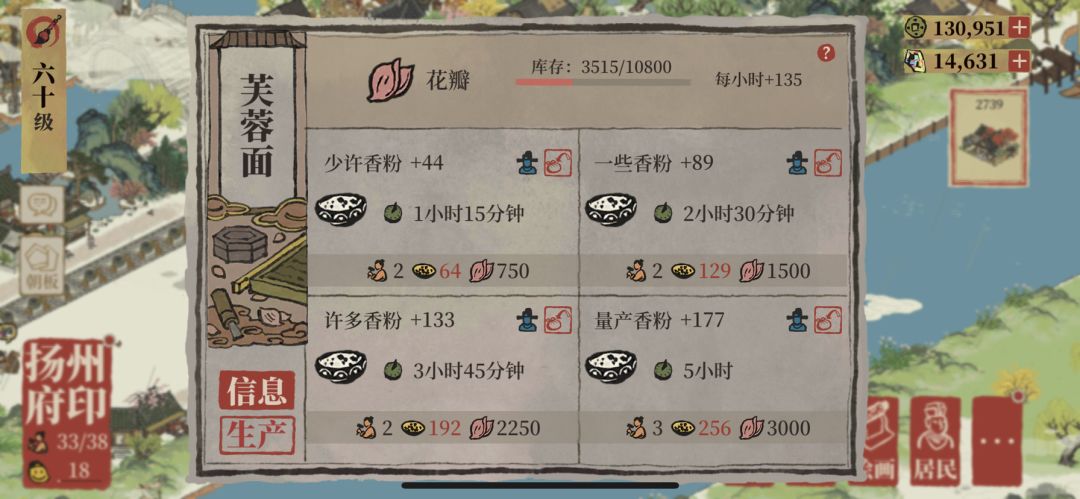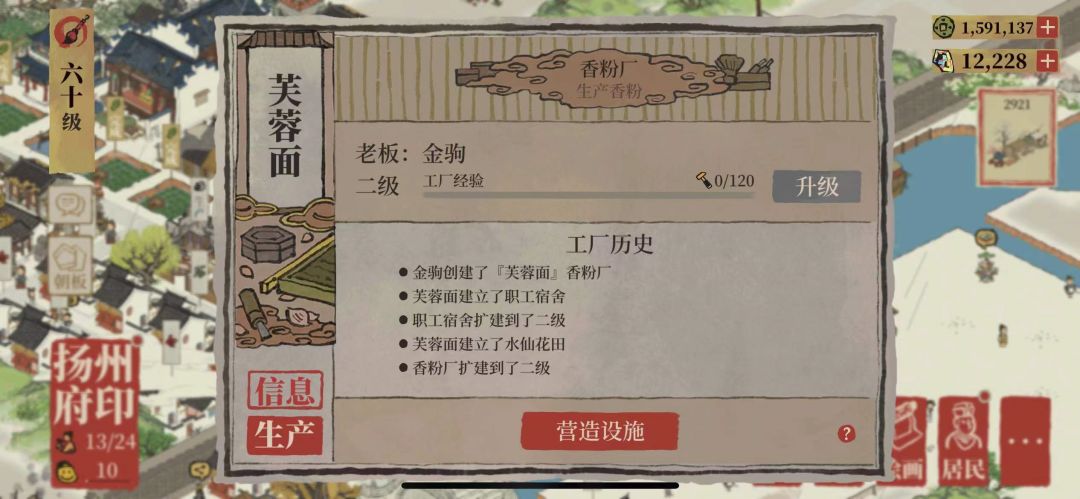 二级香粉厂信息如上,可修建库房储存原料,不建议种花田先,因为目前花瓣够用,但是粟米难得。