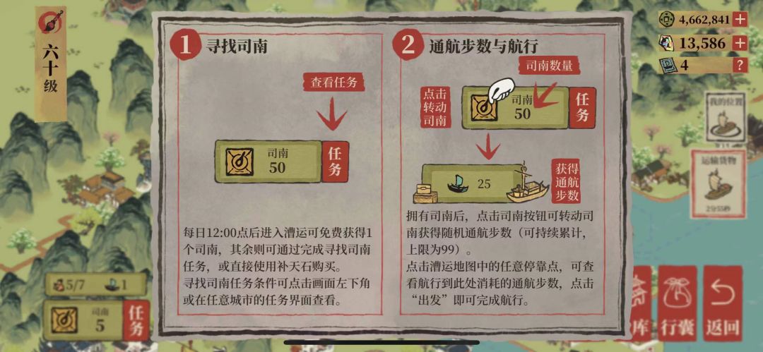(三)用法:进入漕运,点击左下角“司南”转动,每转动一次消耗一个司南,获得随机步数。