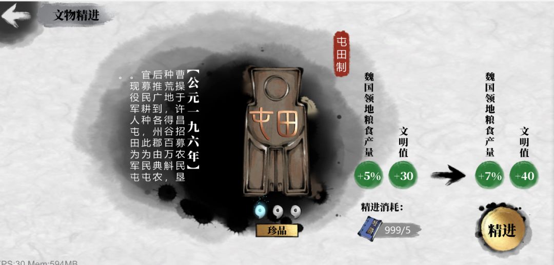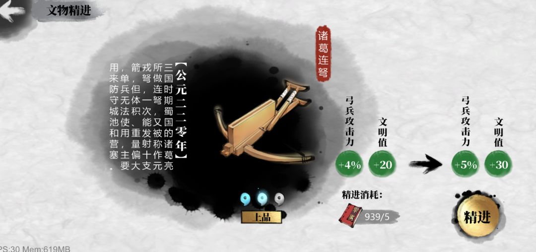 1:每个文物获得后,可以执行三次精进,提升该文物的文明度和效果属性,精进需要消耗对应类型的知识学识,学识知识通过在探访中获得少量,并且在竞技场商店中直接兑换