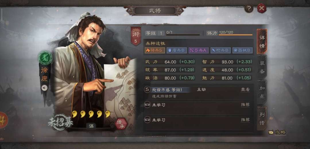 比孙策还垃圾的武将,面板属性其实还不错,就是战法的触发几率感人,基本上就是一个拆解战法专用的武将,没其他用途。