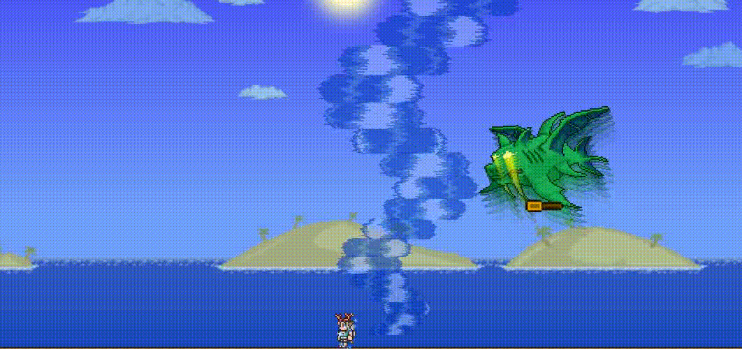 克苏鲁旋风:旋风现在只会生成一个,但是更高,更大,更强!会生成双倍的小鲨鱼进行攻击。