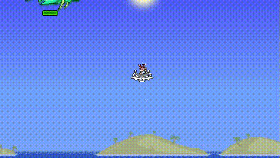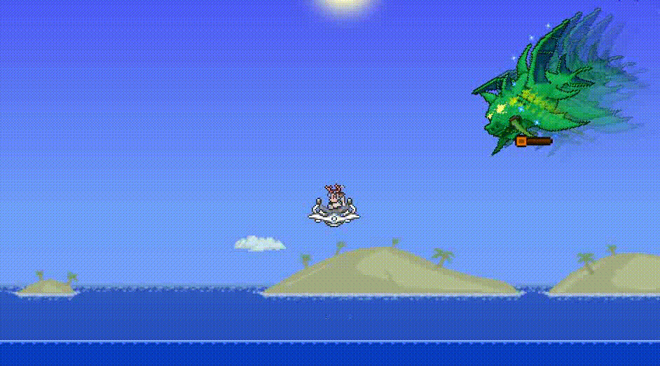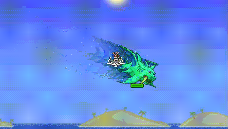 召唤一只可爱的猪龙鱼坐骑!猪龙鱼坐骑可无限飞行,并在接触液体(水、蜂蜜或者岩浆)后获得大量移动速度和小额伤害提升!但请不要让它在地上爬行,因为它在地面上移动真的是太慢啦...