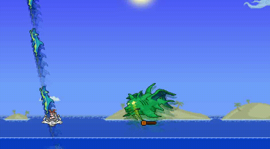 召唤师武器,召唤一个小龙卷风跟随自身,在发现敌怪后自动发射一只小鲨鱼进行攻击。伤害客观但弹道速度并不是很理想,是一件可以选择的召唤师武器。