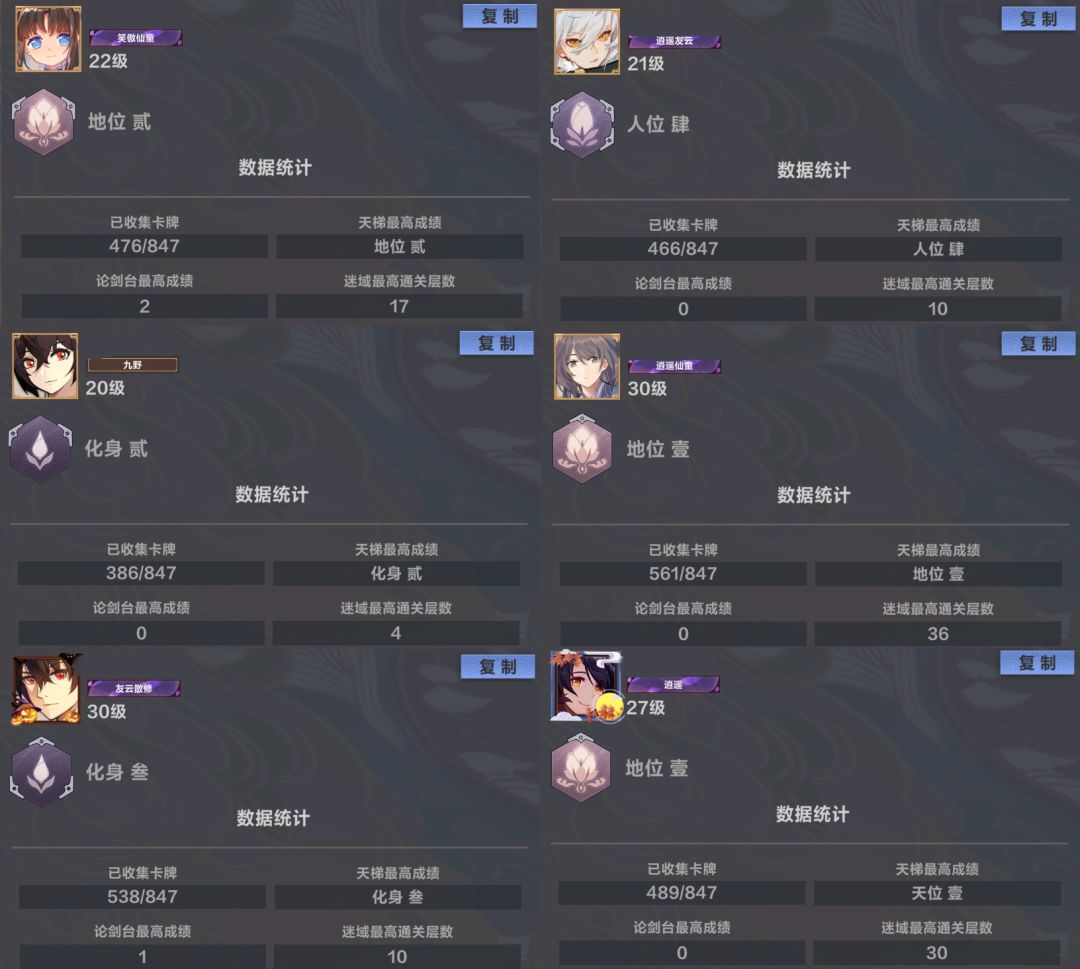 可以看到,基本都是化身、人位、地位,但无一例外都会玩玩谜域,收集的卡牌也都比🐕多,不觉得这很奇怪吗?看得出来,这🐕基本不抽卡,不打谜域。而且21级却到了圣位4?不是说圣位多难,但是这真的很奇怪,这就不是一个正常玩家。