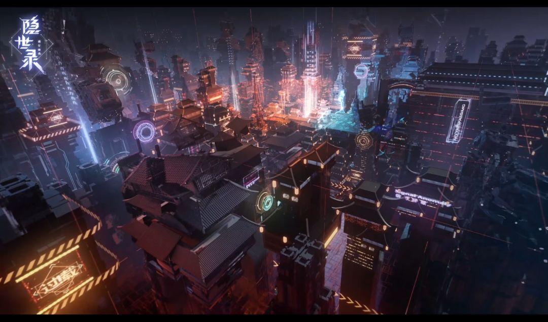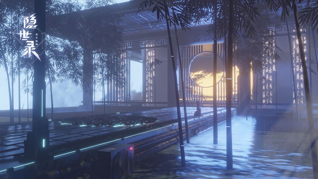 而在中国风与科幻风的融合层面,我们尝试了两种方向,其一是以高科技感的建筑为主体,将飞檐翘角、回字纹、活字印刷、龙图腾等元素掰开揉碎了应用到建筑主体上,使其呈现出和谐的国风科技感;其二是以极简的中式禅意环境为主体,将科幻风的电子人、虚拟投影等元素嵌入进来,形成科幻新中式的写意环境。