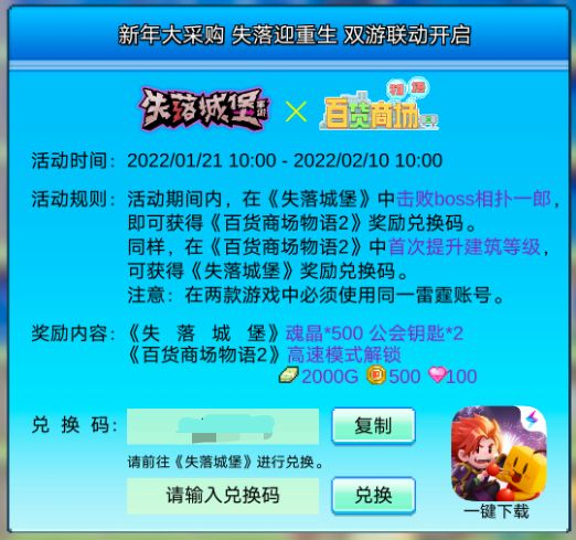 在《失落城堡》单人冒险中【击败第一关boss相扑一郎】,即可获得《百货商场物语2》奖励兑换码