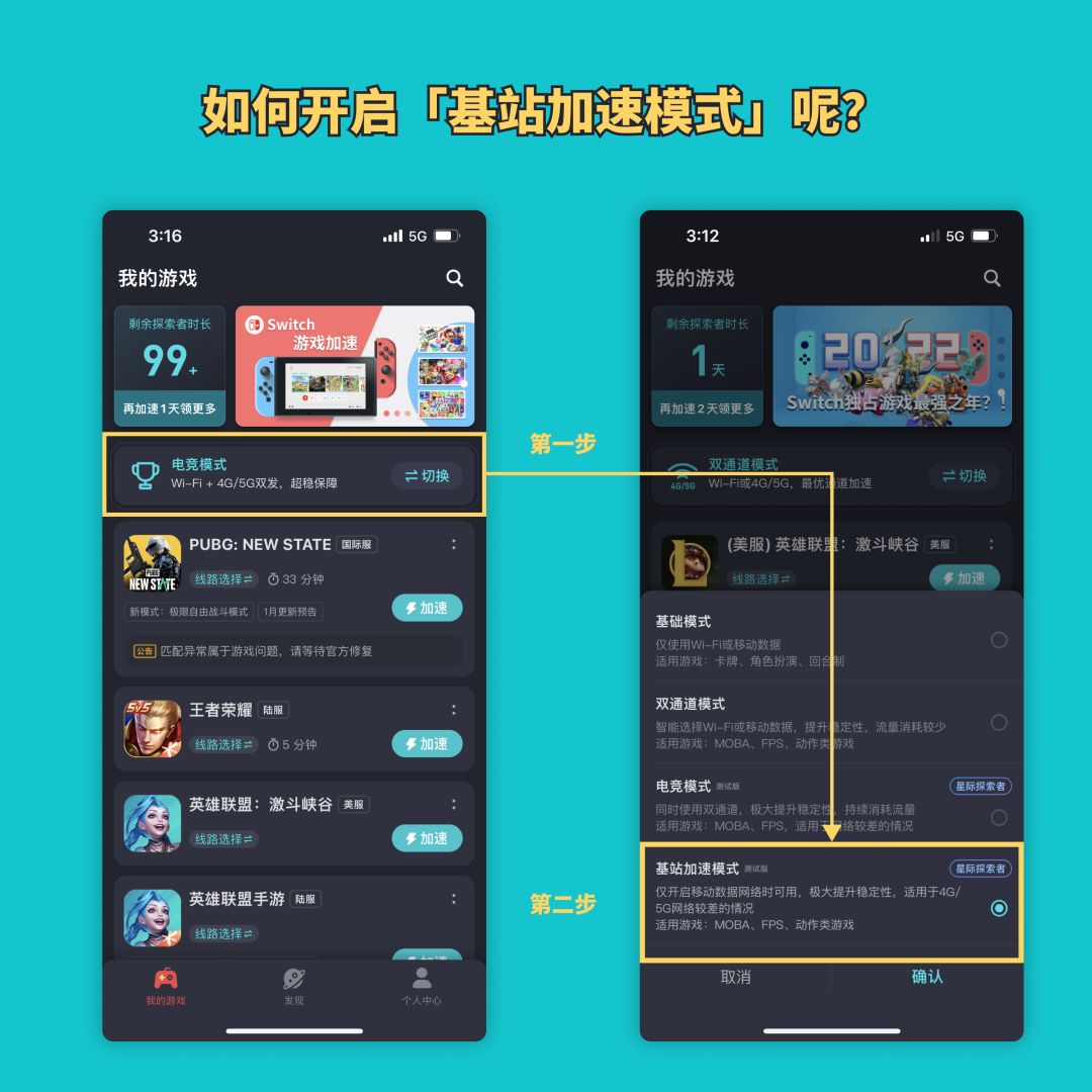 「基站加速模式」专为“仅使用流量”的场景设计,可以极大程度地提升玩游戏的稳定性,支持三大运营商(联通,电信,移动)的 4G 和 5G 网络加速!