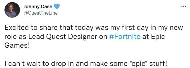Johnny Cash在这篇宣布推文中写道:“很高兴与大家分享,今天是我在Epic Games担任首席任务设计师的第一天!我迫不及待的要去做一些‘史诗’级别的东西了!”