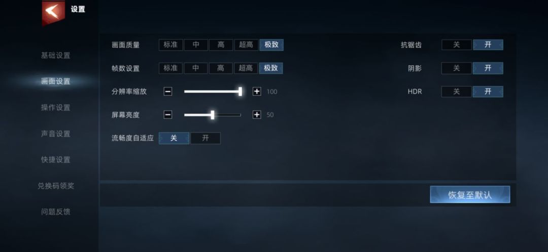 进入游戏点开右上角的设置按钮,然后点开“画质设置”,首先建议把“分辨率缩放” 拉满。其次“画面质量”和“帧数设置” 推荐超高或者极致。 当然如果少侠的手机配置不错,可以考虑把最右边的“抗锯齿”、“阴影”、“HDR” 都打开,以获得更好的游戏体验哦。