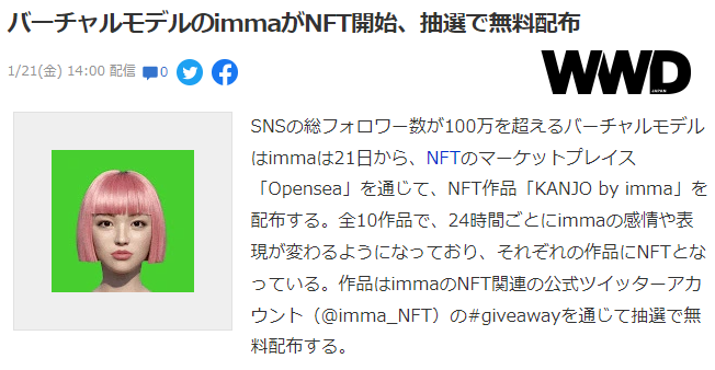 如今在SNS界有着百万粉丝的日系虚拟模特imma于1月21日今天宣布,将发行10个NFT作品,记录自己的每隔24小时的感情表现,与其他网红拍卖赚钱不同的是,将采取抽奖免费发送的形式。