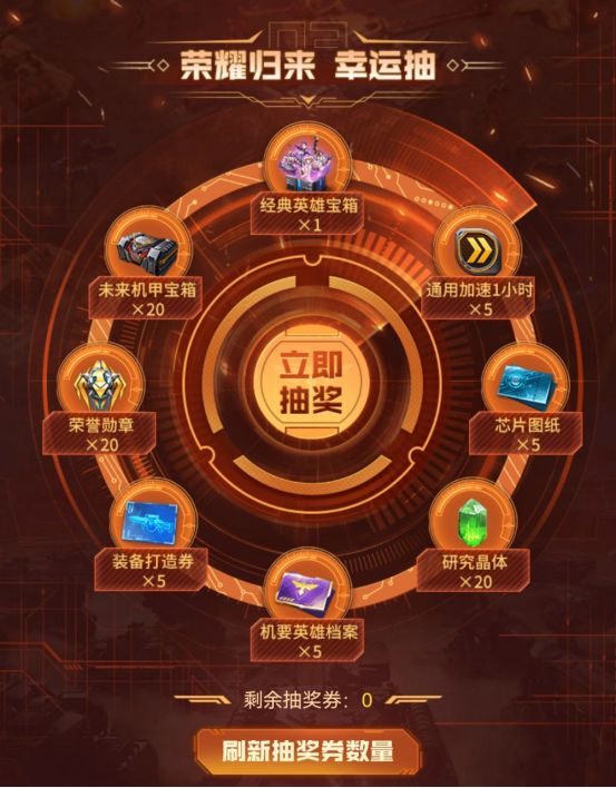 各位指挥官在活动界面中获取的抽奖券,可以在幸运抽环节中抽取大奖,奖池里有经典英雄宝箱、未来机甲宝箱、荣誉勋章、装备打造券等八款游戏道具好礼等待幸运指挥官们解锁,祝各位指挥官欧气满满!