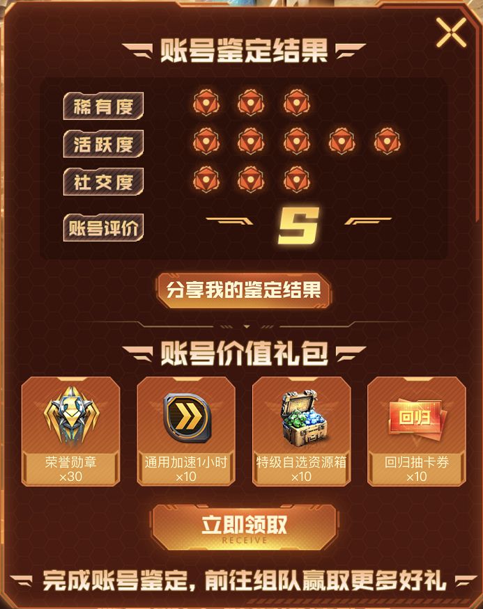 《红警OL》账号价值鉴定中心正式营业,所有完成账号鉴定的指挥官均能领取价值礼包,礼包具体内容由鉴定结果决定,鉴定结果共分为S/A/B/C/D五个层级,分别由以下三个维度综合评定: