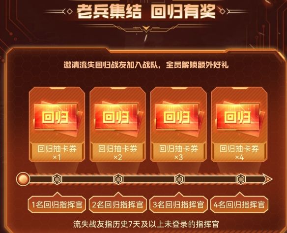 老兵集结,回归有奖!活动期间邀请流失战友回归游戏加入战队,即可解锁回归奖励,快快分享活动召回昔日战友,重燃热血!(流失战友指历史7天以上未登录的指挥官)