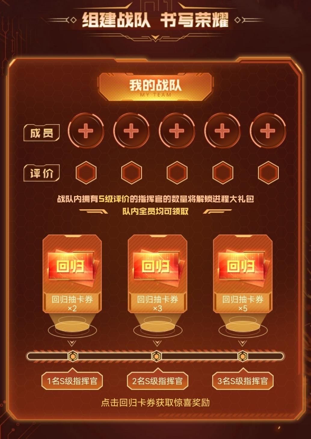 完成账号鉴定后的指挥官可以创建属于自己的战队,或是接受他人邀请加入战队。随着队内S级评价指挥官人数的增加,每位战队成员最多可领取10张回归抽卡券!