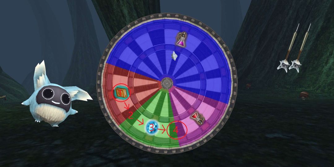 找到图中圆圈4的中心,点击开始后立即狂点那个地方,有很大概率可以扔中。