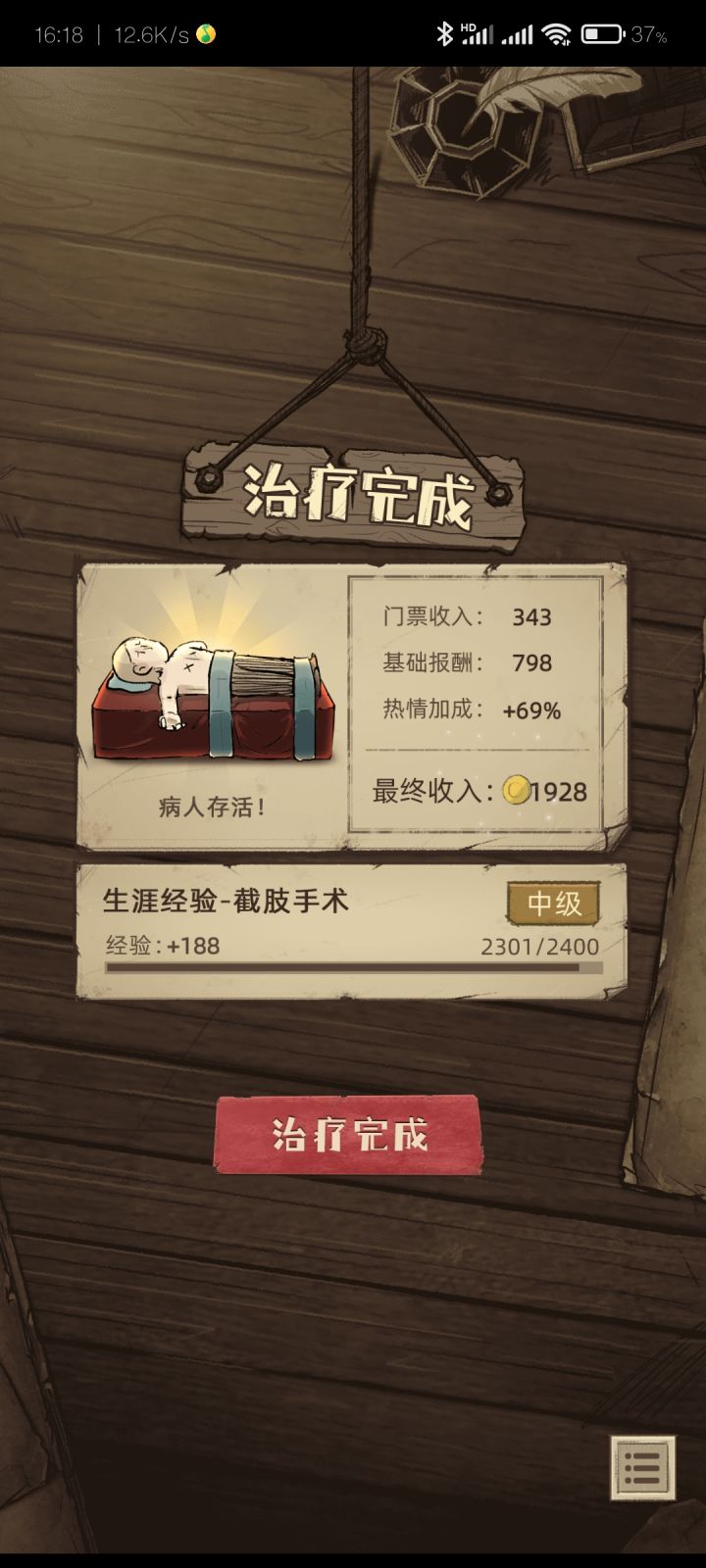 流程:双倍金币++最高费用患者+黄锯/弯锯+满观众+无麻醉+烙铁,死了就祷告,一个市民/官员下来价格少说1000,2000都有,拿来的钱再去升级其他装备或者解锁剧情,达到钱生钱的效果。