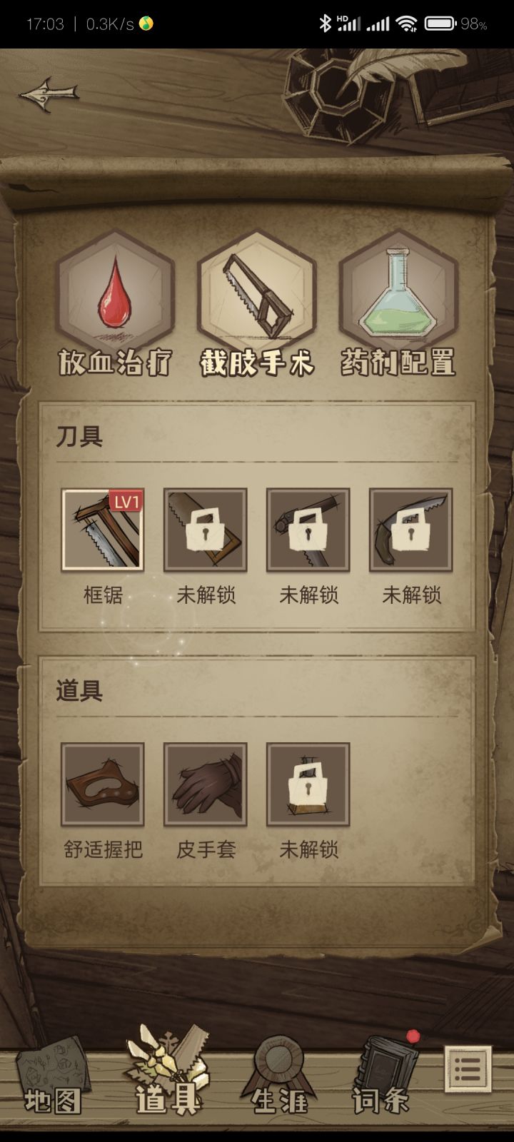 第一把锯子是普通锯,第二把(黄锯)加观赏减疗效,第三把(细锯)加疗效减观赏,最后一把(弯锯)样样精通,前期建议升第二把黄锯,3级左右就行,毕竟是过渡道具,道具选手套(有钱就升级,手套必须拉满不然你中期教会考核过不去直接游戏结束),剩下两个随你便。有了最后一把锯就无脑升级就行,锯子随剧情解锁很快,不像刀那么拖。