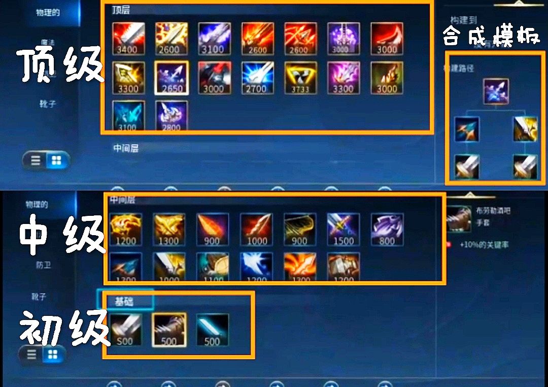 ③装备的合成模式基本都是: 初级→中级→顶级(附魔),价格基本是:500→1000左右→3000左右